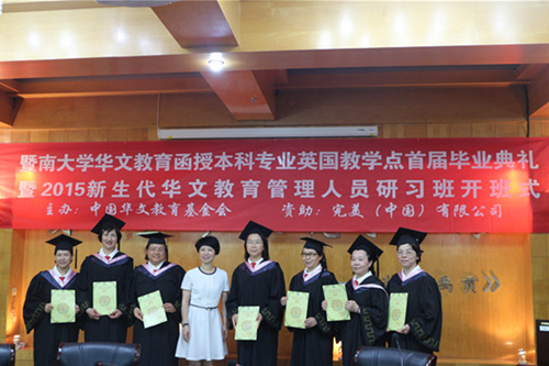 7月28日上午,暨南大学汉语教育专业函授本科英国教学点首届毕业典礼在华文学院举行。同时,由中国华文教育基金会主办、完美(中国)有限公司资助的“新生代汉语教育管理人员研习班”也拉开了帷幕。中国华文教育基金会副理事长兼秘书长左志强、项目二部主任李晓梅,英国中文教育促进会会长伍善雄,暨南大学华文学院院长邵宜等领导和嘉宾,以及研习班全体学员出席了仪式。仪式由华文学院院长助理张礼主持。